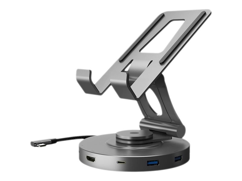 Station d accueil USB-C avec support intégré pour tablette ou smartphone - 1x HDMI 4K/60Hz - 1x USB-C 3.2 Gen 1 (5Gbps) - 1x USB-C Passthrough 65W - 2x USB-A 3.2 Gen 1 (5Gbps) - 1x Jack 3.5mm - 1x carte SD/Micro SD - Pivotable - Câble intégré 20cm - Gris